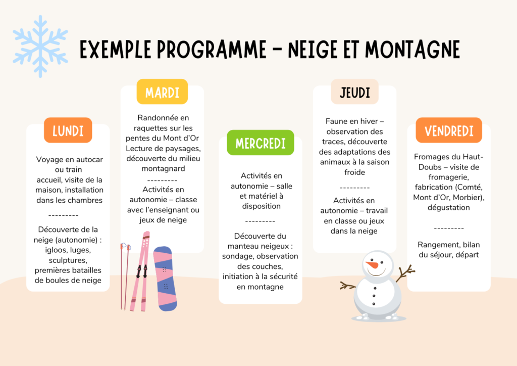 Séjour en pension complète, 5 jours / 4 nuits,du lundi avec votre pique-nique apporté pour le midi, au vendredi déjeuner, avec 4 demi-journées d’activités encadrées pour découvrir la montagne sous la neige et 4 demi-journées d’activités en autonomie (dans nos maisons ou dans les champs de neige alentours, pour faire de la luge, contruire des igloos sans oublier les inoubliables batailles de boules de neige).